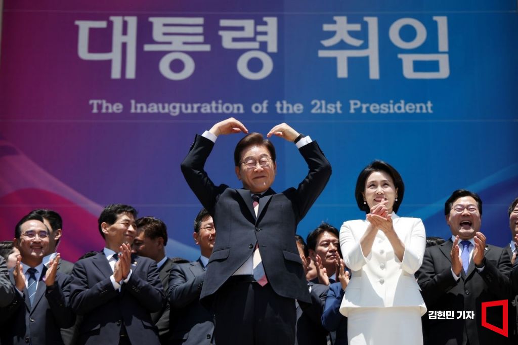 이재명 대통령이 4일 서울 여의도 국회 로텐더홀에서 열린 제21대 대통령 취임선서식을 마친 뒤 잔디광장에 모인 시민들을 향해 하트를 그리고 있다. 오른쪽은 김혜경 여사.