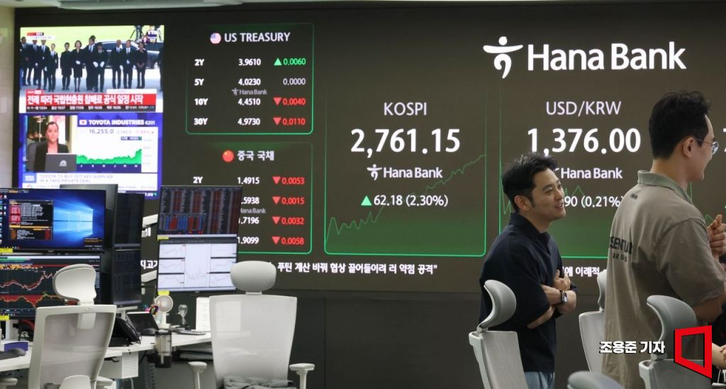 주가 5000시대를 열겠다고 공약한 이재명 후보가 대통령에 당선되면서 국내 증시가 2% 가까이 상승한 4일 서울 중구 하나은행 딜링룸 현황판에 이재명 대통령 관련 뉴스 등이 표시되고 있다. 이날 코스피 지수는 전 거래일 대비 38.95포인트(1.44%) 오른 2,737.92에, 코스닥은 8.84포인트(1.19%) 오른 749.13에 개장했다. 2025.6.4 조용준 기자