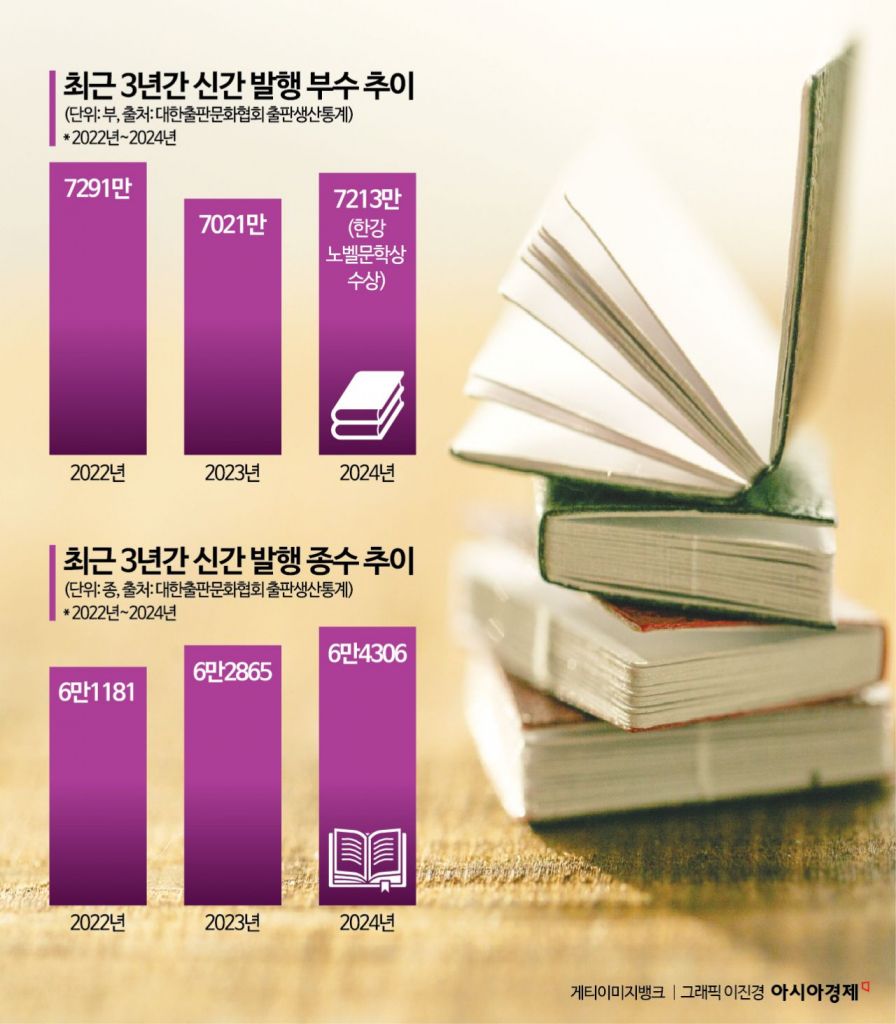 반면 출판 부수는 지속적인 감소세다. 2005년 이후 감소세가 이어지는 가운데, 2024년에는 한강 작가의 노벨문학상 수상 여파로 일시적인 반등이 있었을 뿐이다. 최근 10년간 연간 800만부 가까이 줄어든 해도 있었다. 출판 부수는 2022년 약 7900만부에서 2023년 7000만부로 줄었고, 2024년에는 7200만부 수준을 기록했다.