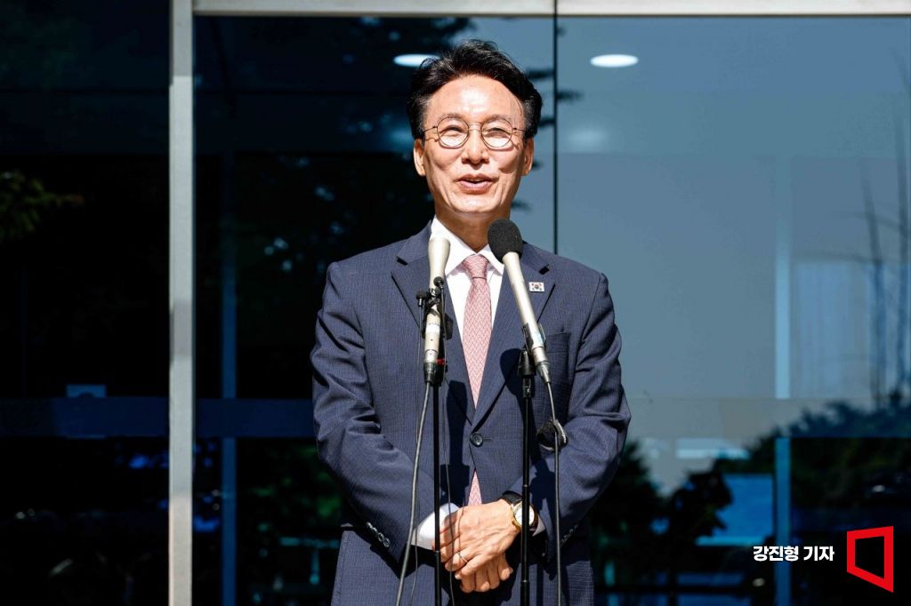 김민석 국무총리 후보자가 5일 서울 종로구 금융감독원 연수원에 마련된 인사청문 사무실에 출근하며 취재진 질문에 답하고 있다.