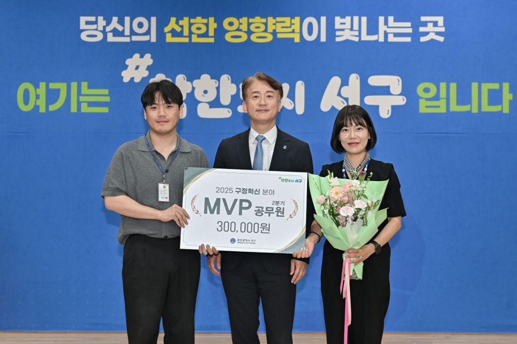 한편 서구의 'MVP 공무원 제도'는 공정하고 신뢰받는 조직문화를 조성하기 위한 자체 포상제도로 분기마다 ▲구정 혁신 ▲대민봉사 분야에서 각 1명을 선정하고 연말에는 '올해의 MVP'를 별도 선발해 조직의 사기와 자긍심을 높이고 있다.