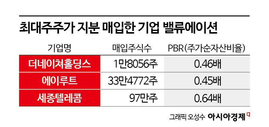 코스닥 상장사 에이루트도 최대주주의 장내 매수 공시에 저평가 매력이 부각된 모양새다. 지난달 27일 에이루트의 최대주주는 약 33만주 규모의 자사주 장내 매수 계획을 공시했다. 지분 확대 공시 이후 에이루트 주가는 지난 5일까지 10%가량 상승했다. 최근 에이루트의 PBR은 0.45배 수준으로 저평가된 상태다.