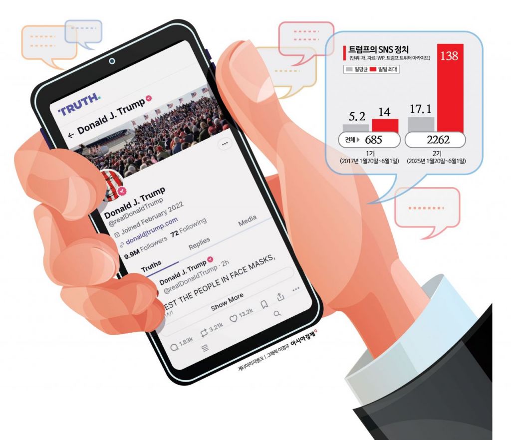 트럼프 대통령의 트루스소셜 팔로워 수는 약 990만명(8일 기준)으로, 1억명이 넘는 엑스(X·엑스) 팔로워 수에 비하면 작은 규모다. 플랫폼의 파워만 비교해봐도 그렇다. 전 세계인이 사용하는 엑스와 트럼프 대통령 지지자 중심으로 이용하는 트루스소셜의 영향력을 비교하기는 어렵다. 그러나 2기 행정부에서 SNS 정치의 힘은 훨씬 강력해졌다.