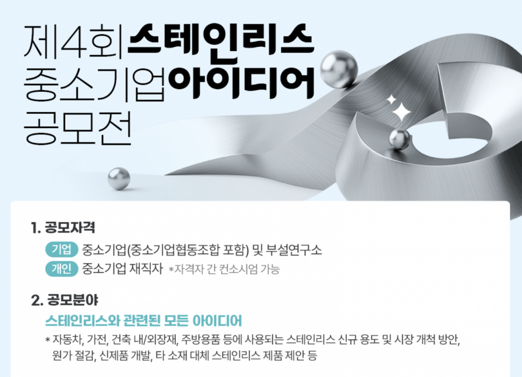 이번 공모전은 2022년에 시작돼 네 번째 개최되는 행사로 스테인리스에 적용 가능한 제품·기술·아이디어를 발굴하기 위해 마련됐다. 산업통상자원부, 중소벤처기업부, 포스코, 현대비앤지스틸의 후원으로 진행된다.