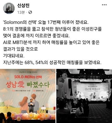 이어 신상진 시장은 "AI로 MBTI 분석까지 하여 매칭률을 높이고 있어 좋은 결과가 있을 것으로 기대되네요"라며 "지난주에는 68%, 54%의 성공적인 매칭률을 보였네요"라고 밝혔다.