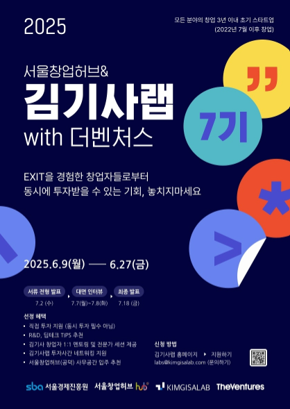 이번 7기에는 더벤처스가 협력 파트너로 참여해 참여팀에 대한 투자 검토를 함께 진행한다. 참가팀엔 ▲1억원 이상의 초기 투자 ▲김기사 창업자 일대일 밀착 멘토링 ▲연구개발(R&D) 딥테크 TIPS(팁스, 민관협력형 창업지원 사업) 추천 ▲서울창업허브 공덕센터 입주 연계 ▲ 국내외 창업가 및 전문가 네트워킹 등 다양한 성장 기회가 제공된다. 투자 심사는 양측이 별도로 진행하며, 동시 투자는 스타트업의 상황과 선택에 따라 유연하게 적용된다.