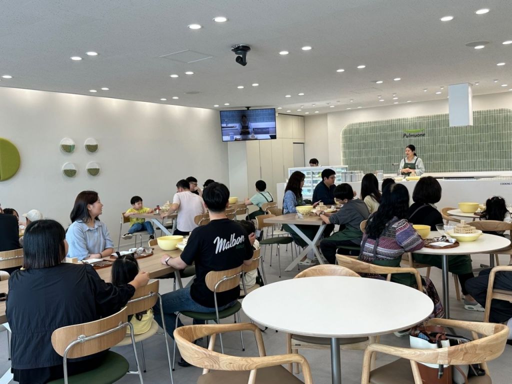 풀무원 두부공장 견학 프로그램에 참가한 고객들이 리뉴얼된 쿠킹 스튜디오에서 체험 담당자의 설명을 듣고 있다.