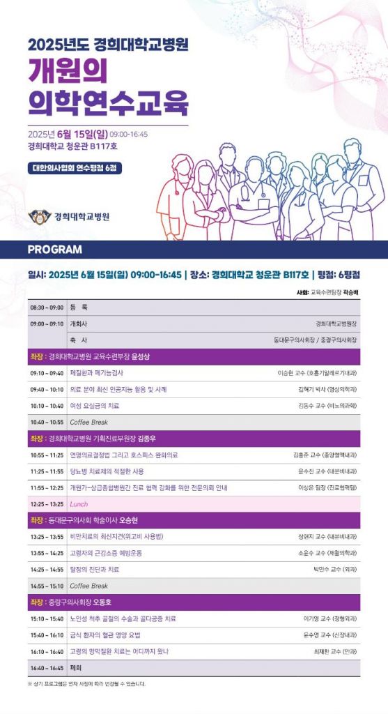 경희대학교병원이 오는 15일 서울 동대문구 경희대학교 청운관에서 '2025 개원의 의학연수교육'을 개최한다.