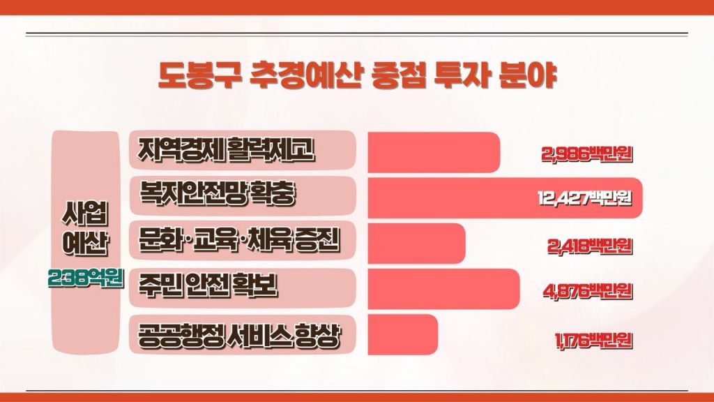 오언석 도봉구청장은 “이번 추경예산안은 불확실한 경제 여건에도 사회안전망을 더욱 두텁게 하고, 지역 골목상권을 활성화하는 것에 방점을 뒀다”며 “추경안이 의회를 통과하는 대로 신속하게 집행해 구민들이 변화된 모습을 체감할 수 있도록 하겠다”고 말했다.