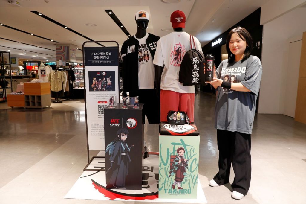 광주신세계 플레이 스팟에서 UFC 직원이 귀멸의 칼날 콜라보레이션 제품을 들고 포즈를 취하고 있다. 광주신세계 제공