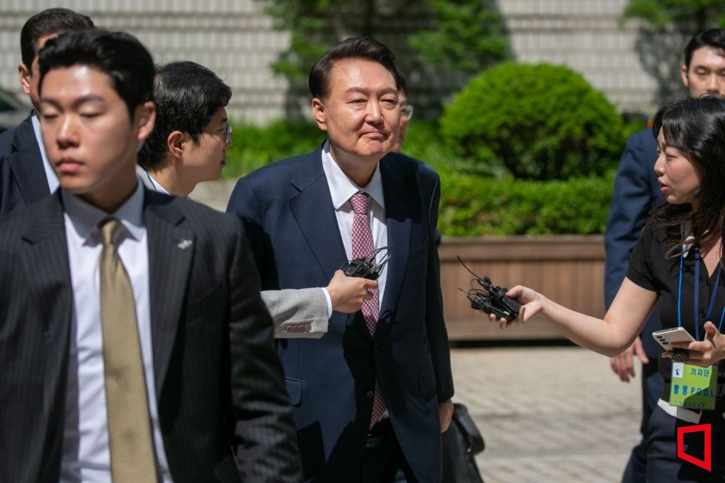 윤석열 전 대통령이 9일 오전 서울 서초구 서울중앙지방법원에서 내란 우두머리 혐의 사건 6차 공판에 출석하고 있다. 2025.6.9 사진공동취재단