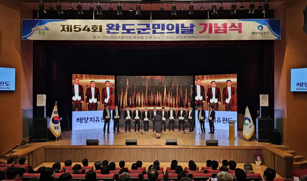 이날 기념식은 한국무용팀 축하 공연으로 시작해 군정 홍보 영상 상영, 군민헌장 낭독, 유공자 시상, 기념사·축사, '완도의 찬가' 제창, 기념식수 순으로 진행됐다. 특히 완도여자중학교 댄스 동아리와 지역 남성 중창단 '블루' 등 군민들의 자발적 참여가 행사 분위기를 한껏 끌어올렸다.