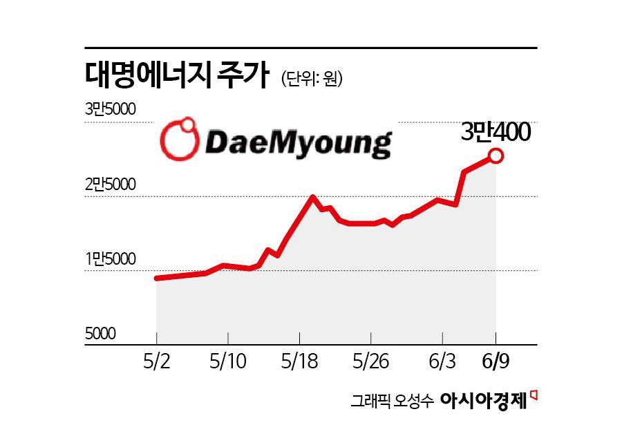 10일 금융투자업계에 따르면 대명에너지 주가는 4월 말 대비 105.4% 상승했다. 같은 기간 코스닥 지수가 6.5% 오른 것을 고려하면 시장 대비 수익률은 98.9%포인트(P)에 달한다.