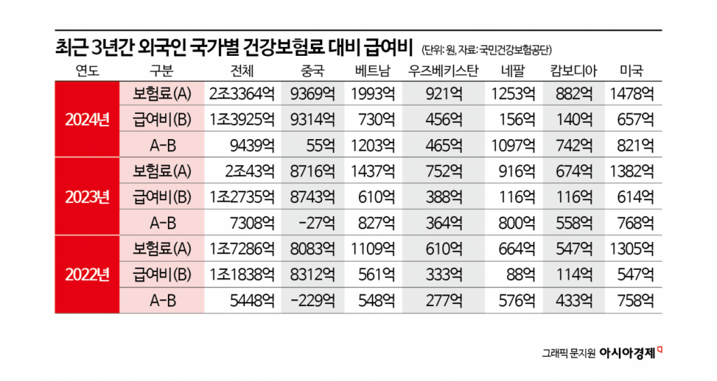 9일 국회 보건복지위원회 소속 서명옥 국민의힘 의원이 국민건강보험공단으로부터 제출받은 '외국인 건강보험 재정 수지' 자료에 따르면, 2024년 중국인들에게 부과한 건강보험료는 총 9369억원, 이들이 의료기관 등에서 지출한 의료비는 9314억원으로 재정 수지(보험료-급여비)는 55억원 흑자를 기록했다.