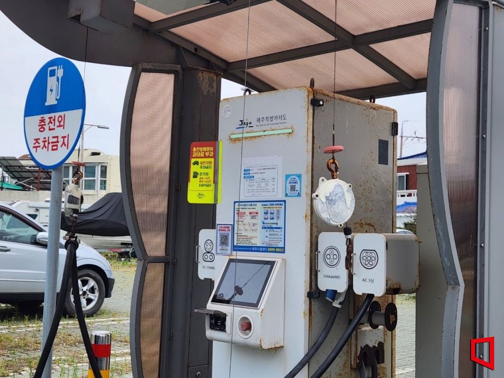 제주도에서 운영 중인 전기차 충전기가 부식으로 노후화 되고 있다. 전기 전문가들에 의하면 바닷가에 운영 중인 충전기는 염분에 의한 부식 진행이 육지에 비해 빠를 수 있다고 조언하고 있다. 박창원 기자.