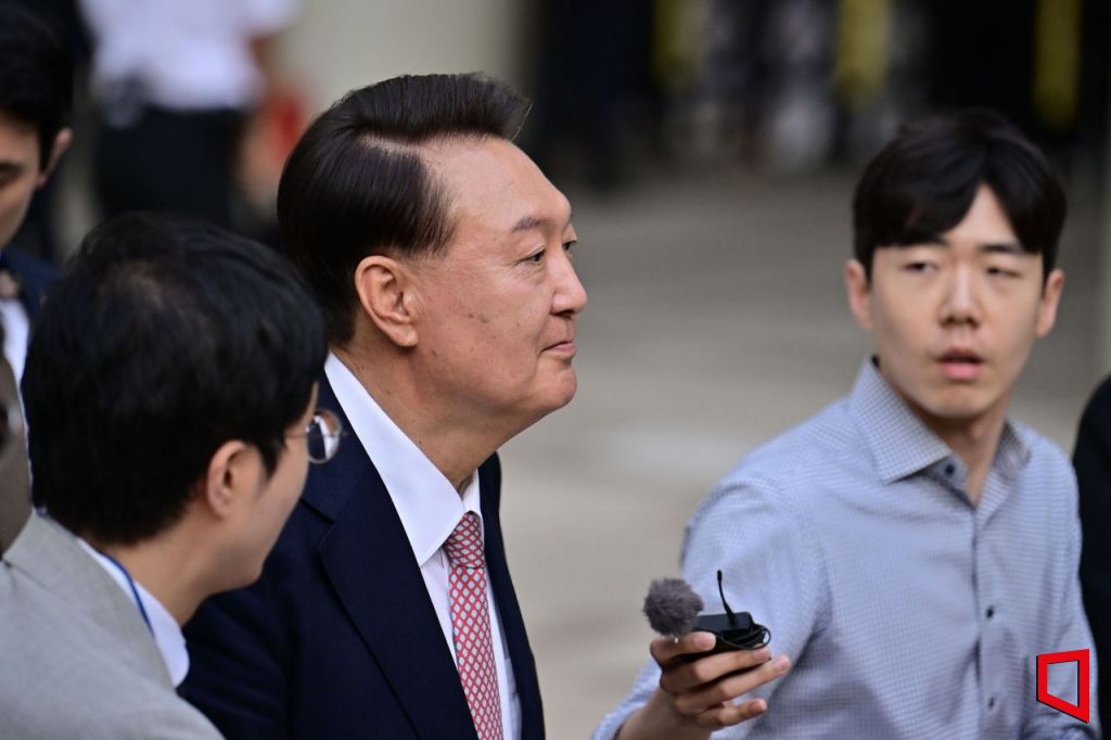 윤석열 전 대통령이 9일 오후 서울 서초구 중앙지방법원에서 열린 내란 우두머리 혐의, 직권남용 권리행사방해 혐의 사건 6차 공판을 마친 후 취재진의 질문을 받으며 법원을 나서고 있다. 사진공동취재단