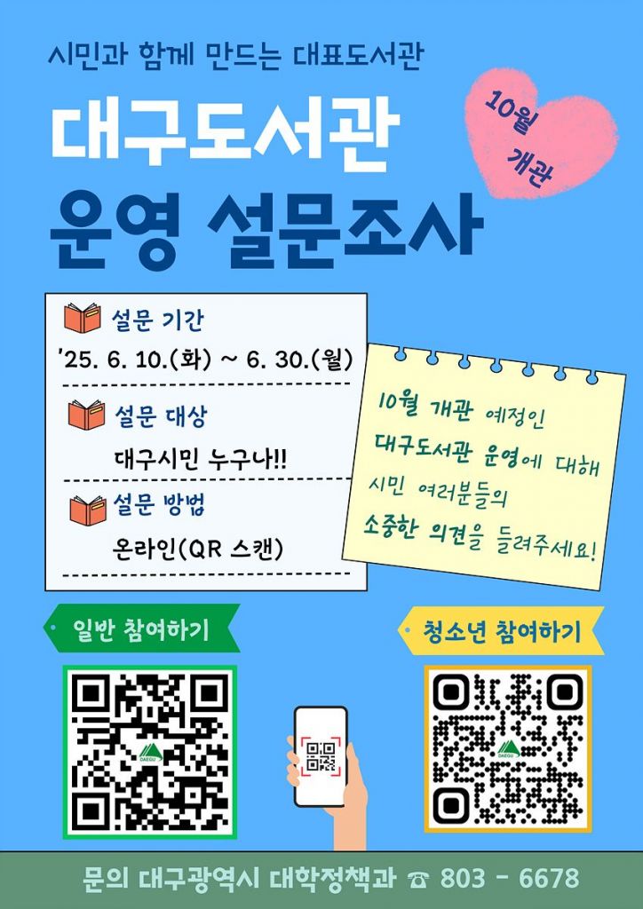 설문조사는 온라인으로 진행하며 큐알(QR)코드로 접속해 간편하게 참여할 수 있으며, 자세한 사항은 대구통합도서관 홈페이지 공지 사항 게시판을 참고하거나 대구시 대학정책과 도서관운영준비TF팀으로 문의하면 된다.