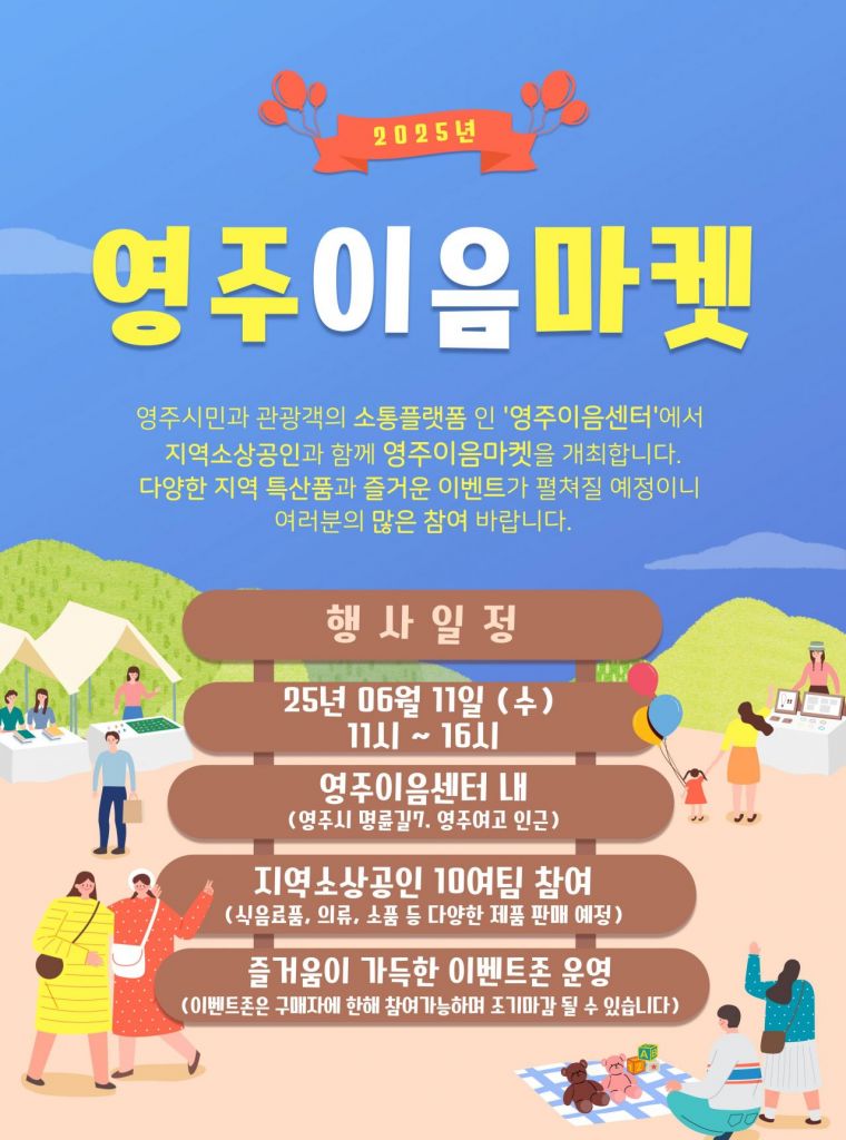 행사는 오전 11시부터 오후 4시까지 진행되며 지역경제 활성화와 공동체 소통을 위한 장으로 마련됐다. 영주시 관광협의회가 주관하고 영주이음센터가 지역 소상공인에게 판로를 제공하는 취지로 기획됐다.