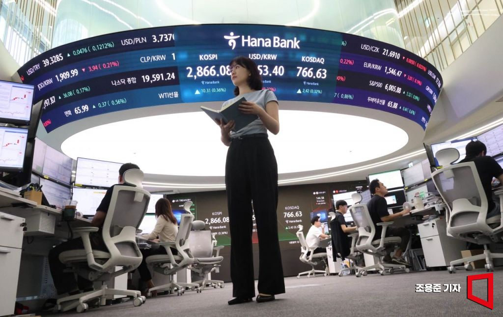 새 정부 기대감에 코스피가 강세를 이어가고 있는 가운데 10일 서울 중구 하나은행 딜링룸 현황판에 코스피 지수, 원/달러 환율, 코스닥 지수가 표시되고 있다. 이날 코스피는 전 거래일보다 10포인트 이상 오르며 2,870대로, 원/달러 환율은 2원 가량 내린 1,353원대로 거래를 시작했다.