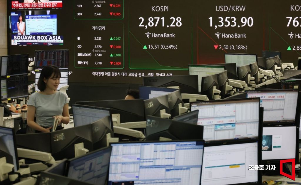 새 정부 기대감에 코스피가 강세를 이어가고 있는 가운데 10일 서울 중구 하나은행 딜링룸 현황판에 코스피 지수, 원/달러 환율, 코스닥지수가 표시되고 있다. 이날 코스피는 전 거래일보다 10포인트 이상 오르며 2,870대로, 원/달러 환율은 2원가량 내린 1,353원대로 거래를 시작했다.