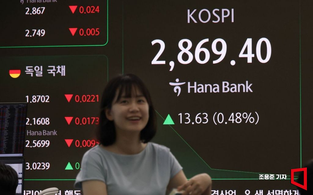 새 정부 기대감에 코스피가 강세를 이어가고 있는 가운데 10일 서울 중구 하나은행 딜링룸 현황판에 코스피 지수, 원/달러 환율, 코스닥지수가 표시되고 있다. 이날 코스피는 전 거래일보다 10포인트 이상 오르며 2,870대로, 원/달러 환율은 2원가량 내린 1,353원대로 거래를 시작했다.