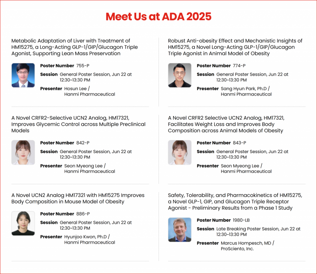 공개되는 연구 결과는 ▲HM15275의 임상 1상 결과 ▲비만 동물 모델에서 HM15275의 강력한 체중 감소 효능 및 작용 기전 ▲HM15275의 터제파타이드(젭바운드) 대비 체중 감량 질 개선 기전 제시 ▲HM17321의 체중 감량 및 차별화된 체성분 개선 효과 ▲HM17321의 혈당 조절 개선 효과 ▲HM15275와 HM17321 병용 시 나타나는 체성분 개선 시너지 효과 등 총 6건이다.