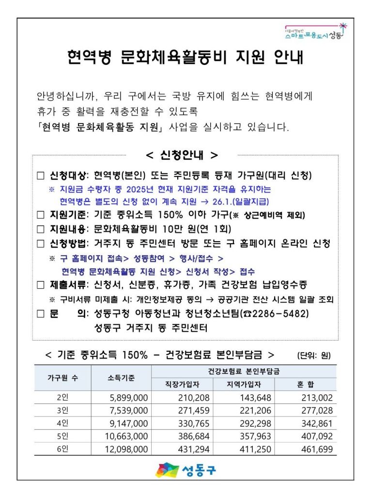 성동구는 2018년에 지원 대상을 국민기초생활수급자 및 차상위 계층에서 중위소득 100% 이하 가구로 확대한 데 이어, 올해부터는 중위소득 150% 이하로 다시 한번 기준을 완화해 더 많은 현역병이 혜택을 받을 수 있도록 했다. 신청 방법은 현역병 본인 또는 가족이 구청 누리집을 통해 온라인 신청하거나 거주지 동 주민센터에 방문하면 된다.