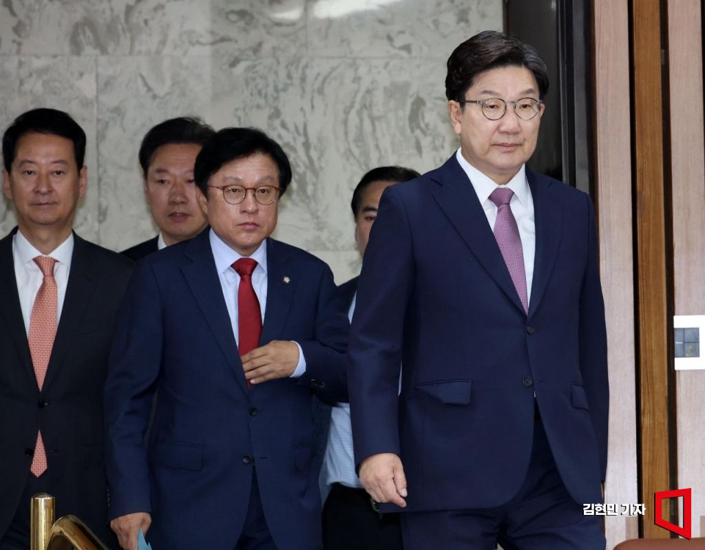 권성동 국민의힘 원내대표가 10일 국회에서 열린 원내대책회의에 참석하고 있다.