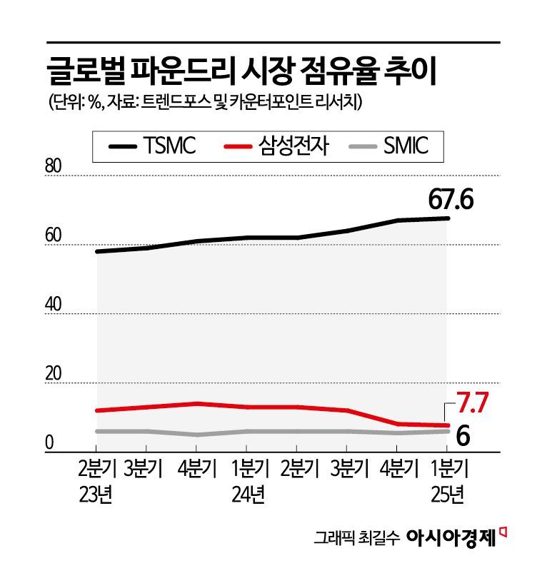 삼성은 지난해 1분기까지 점유율 13%로 SMIC를 크게 앞섰지만, 2024년 4분기부터 하락세가 두드러졌고 올해 들어 격차는 1%p대로 줄었다. 반면 SMIC는 5~6% 수준의 점유율을 안정적으로 유지하고 있다.