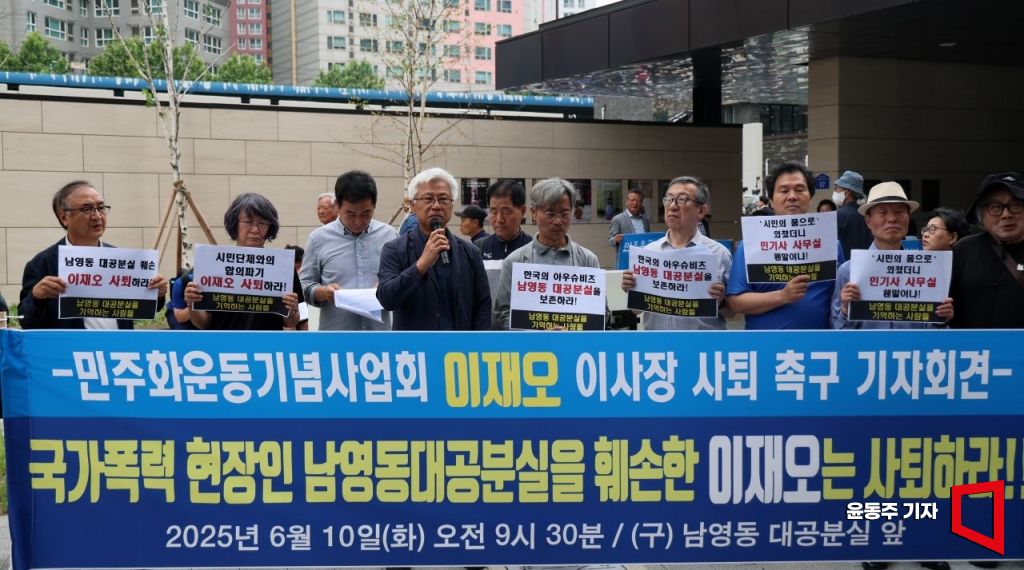 10일 서울 용산구 민주화운동기념관(옛 남영동 대공분실)앞에서 '남영동 대공분실을 기억하는 사람들' 단체 회원들이 이재오 민주화운동기념사업회 이사장 퇴진을 촉구하는 기자회견을 갖고 있다.