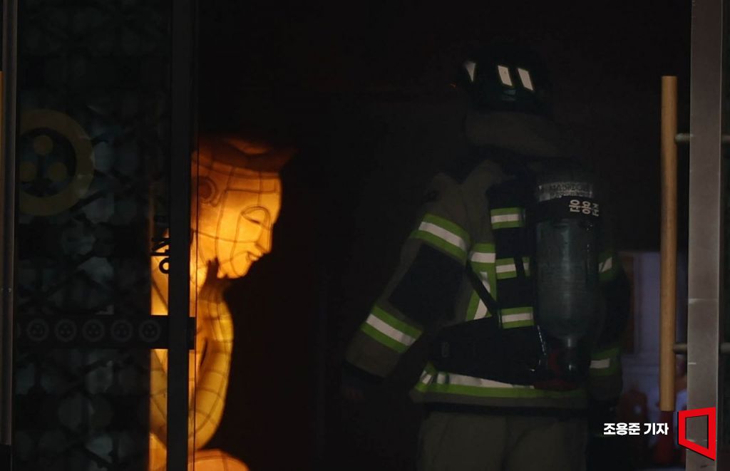 10일 서울 종로구 조계사 옆 한국불교역사문화기념관 국제회의장에서 화재가 발생해 소방관들이 진화작업을 펼치고 있다.