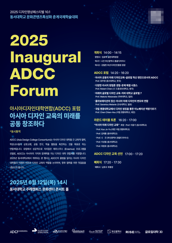 2025 아시아디자인대학연합(Asia Design Colleges Consortium, ADCC) 포럼이 오는 12일, 동서대 주례캠퍼스 문화센터 콘서트홀에서 개최된다.