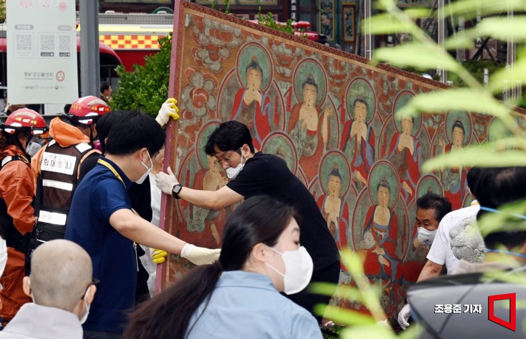 10일 서울 종로구 조계사 옆 한국불교역사문화기념관 국제회의장에서 화재가 발생해 관계자들이 문화재를 옮기고 있다.