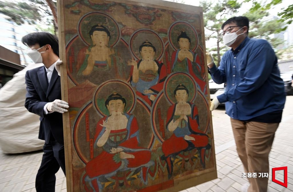 10일 서울 종로구 조계사 옆 한국불교역사문화기념관 국제회의장에서 화재가 발생해 관계자들이 문화재를 옮기고 있다. 2025.6.10 조용준 기자