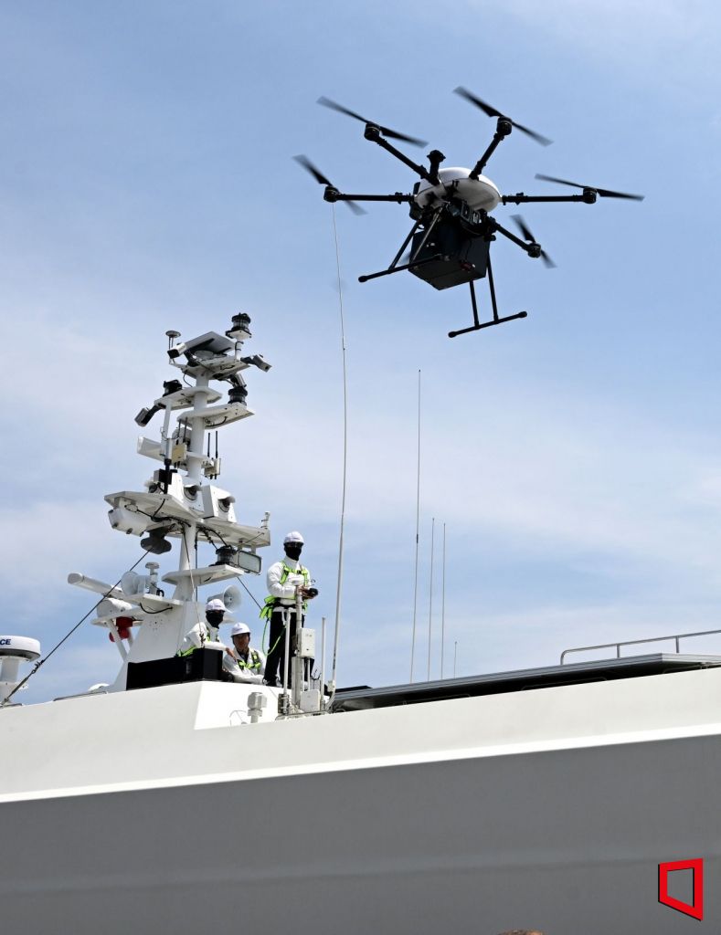 정찰·감시용 드론이 드론모함을 출발해 해상표적을 추적하고 있다. 이번 훈련에 참가한 정찰·감시용 드론은 참치어군탐지용으로 개발 운용되었으며; 체공시간은 3시간; 속력은 약 시속 80km이다.