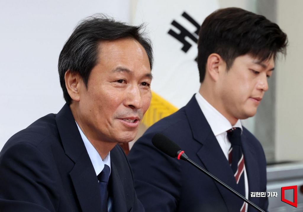 우상호 대통령실 정무수석(왼쪽)이 10일 서울 여의도 국회에서 김용태 국민의힘 비상대책위원장을 만나 발언하고 있다.
