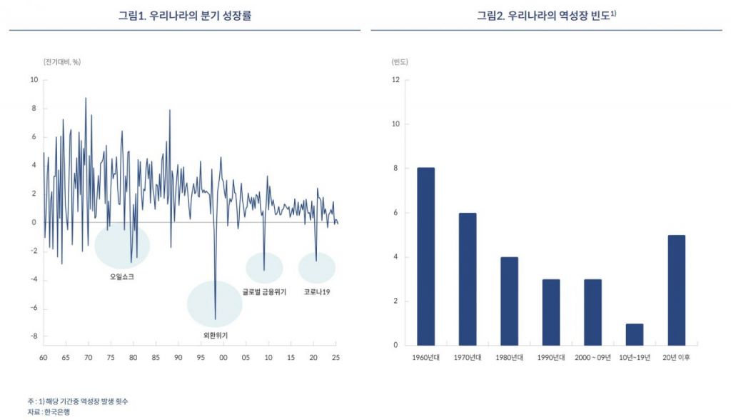 그런데 2010년대 후반 이후 성장률 평균이 계속 낮아지는 상황에서 변동성은 확대되면서 역성장 빈도가 다시 높아지고 있다고 한은은 분석했다. 2010년대에는 2017년 4분기 한 차례에 그쳤으나, 2020년대 들어서는 코로나19와 같은 경제위기 외에도 다양한 대내외 충격으로 인해 5년 사이 다섯 차례의 역성장이 발생한 상황이다.