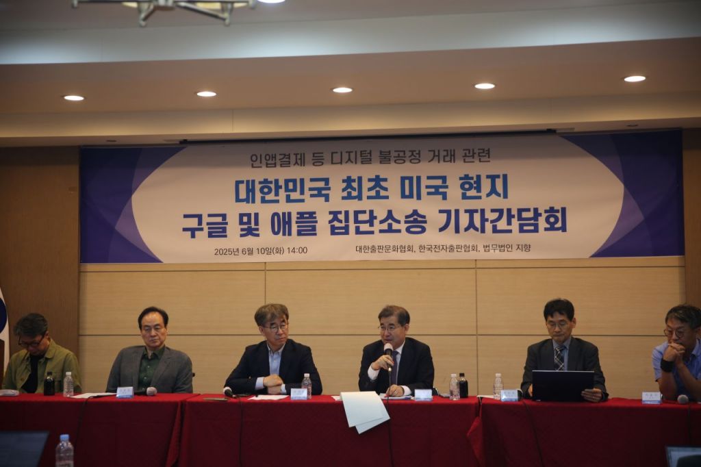 10일 오후 서울 종로구 소재 대한출판문화협회(출협)에서 진행한 구글 및 애플 상대 미국 현지 집단 소송 간담회 모습. 왼쪽부터 출협 한상준 정책담당 상무이사, 한국전자출판협회 김환철 회장, 출협 윤철호 회장, 법무법인 지향 이은우 변호사, 이병주 변호사, 출협 박용수 전자출판·정책담당 상무이사. 대한출판문화협회