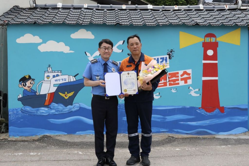 광양제철소 에버그린 벽화 재능봉사단이 여수해경으로부터 감사장을 수상했다. 사진 왼쪽부터 김기용 여수해양경찰서장, 강성환 에버그린 벽화 재능봉사단장. 광양제철소 제공
