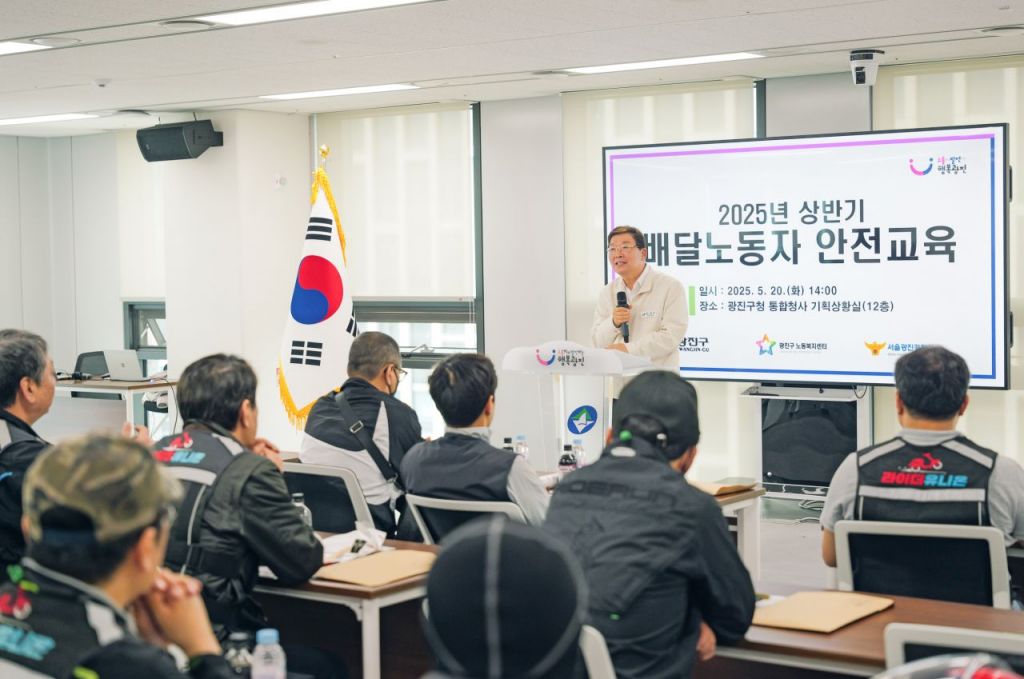 김경호 광진구청장이 배달노동자 교육에서 인사말씀을 하고 있다. 광진구청 제공.