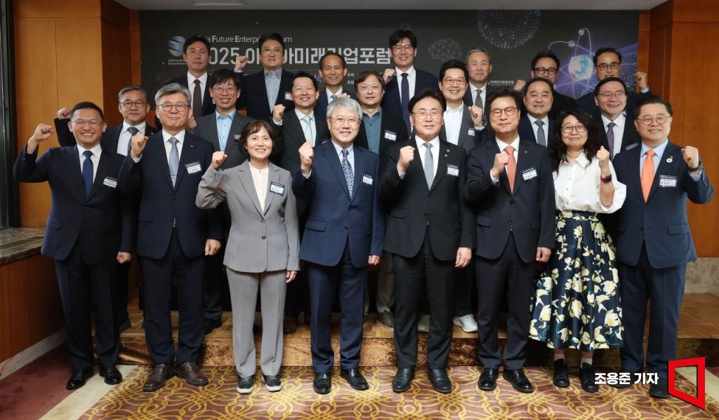 11일 서울 중구 롯데호텔에서 열린 '2025 아시아미래기업포럼' 참석자들이 한국표준과학원의 양자컴퓨터 모형 옆에서기념촬영을 하고 있다. 앞줄 왼쪽부터 정우성 한국과학창의재단 이사장, 오상록 한국과학기술연구원장, 윤진희 한국물리학회장, 장범식 아시아경제 대표, 유상임 과학기술정보통신부 장관, 김영식 국가과학기술연구회 이사장, 백한희 IBM리서치 퀀텀 알고리즘 센터 총괄디렉터, 박일준 대한상공회의소 상근부회장. 두번째줄 왼쪽부터 황판식 과학기술인공제회 이사장, 오태석 한국과학기술기획평가원장, 이상민 SK텔레콤 글로벌A&I센터 성장사업추진실장, 이준구 큐노바 대표, 엄상윤 아이디큐코리아 대표, 정철 한국경제연구원장, 이식 한국과학기술정보연구원장. 세번째줄 왼쪽부터 신범수 아시아경제 편집국장, 김승철 삼일PwC경영연구원 수석연구위원, 이창희 한국정보통신진흥협회 상근부회장, 한상욱 한국양자정보학회장, 김정회 한국반도체산업협회 상근부회장, 김성혁 LG전자 퀀텀 AI 태스크 수석연구위원, 김효실 미래양자융합센터장.