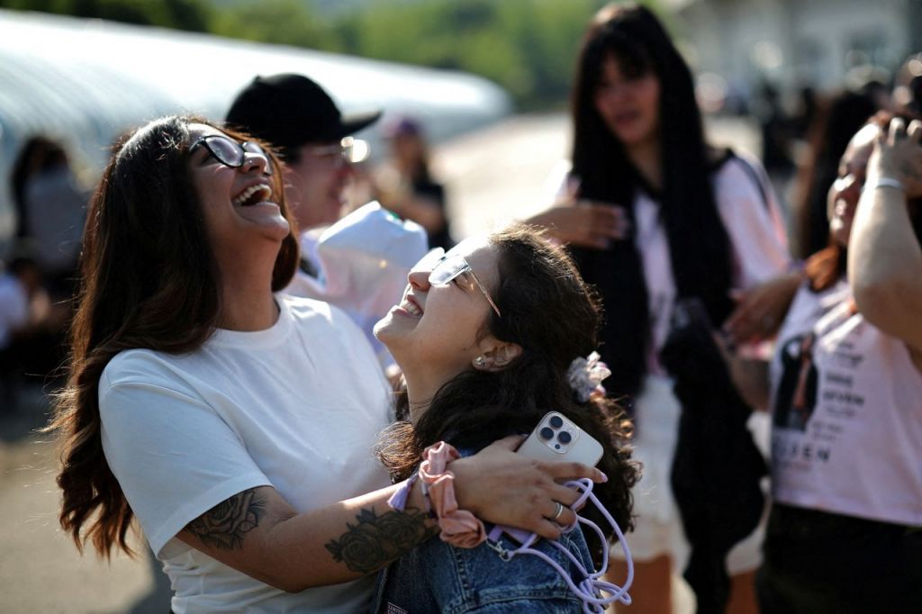 BTS의 팬덤 아미가 11일 경기도 연천군 연천공설운동장에서 이날 전역하는 BTS 지민·정국을 기다리는 모습. 연합뉴스