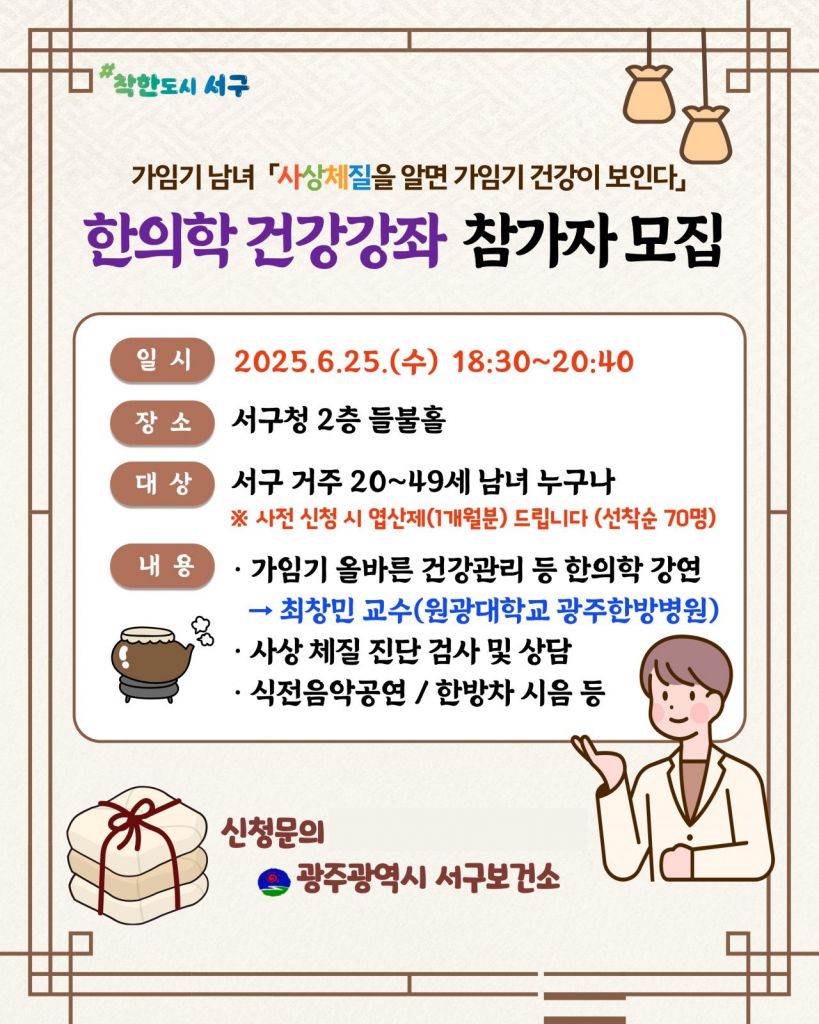 광주시 서구가 오는 25일 서구청 들불홀에서 한의학 건강 강좌 '사상체질을 알면 가임기 건강이 보인다'를 진행한다.