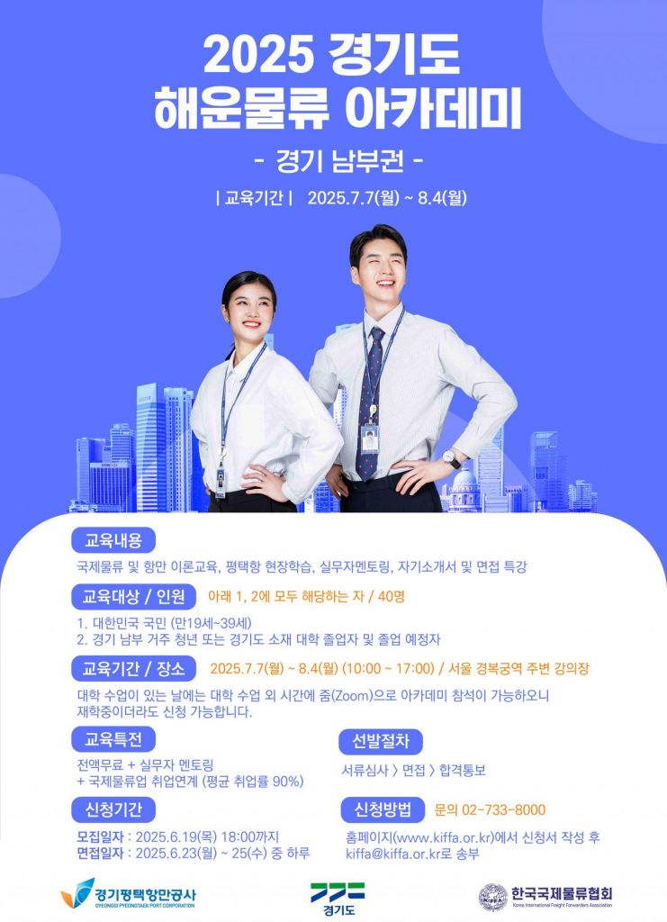 경기평택항만공사가 해운·항만·물류 전문인력의 양성을 위해 오는 19일까지 '해운물류 아카데미' 교육생 40명을 모집한다. 지원 대상은 도내 거주 청년(19세~34세) 또는 도내 대학 졸업(예정)자다.