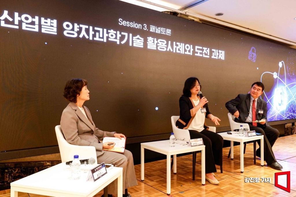 11일 서울 중구 롯데호텔에서 아시아경제 주최로 열린 ‘2025 아시아미래기업포럼’에서 토론자들이 ‘산업별 양자과학기술 활용사례와 도전과제’란 주제로 토론하고 있다. 왼쪽부터 윤진희 한국물리학회 회장, 정희정 파스칼코리아 전무, 김재완 연세대학교 양자연구원 원장. 강진형 기자