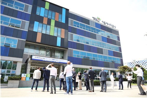 서울에너지공사에 EU Business Hub 참가자들이 방문, 태양광 신기술 실증단지를 견학하고 있다. 서울에너지공사 제공.