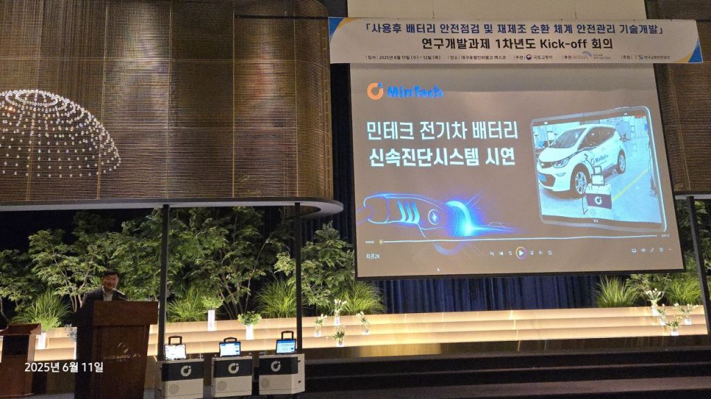 배터리 검사·진단 전문기업 민테크(대표 홍영진)는 11일 대구 호텔 인터불고 엑스코에서 국토교통부 산하 한국교통안전공단 주관하에 열린 '사용후 배터리 안전 점검 및 재제조 순환 체계 안전관리 기술개발 과제 킥오프 회의'에서 '전기차 배터리 신속 진단시스템' 을 공식 출시했다고 밝혔다.