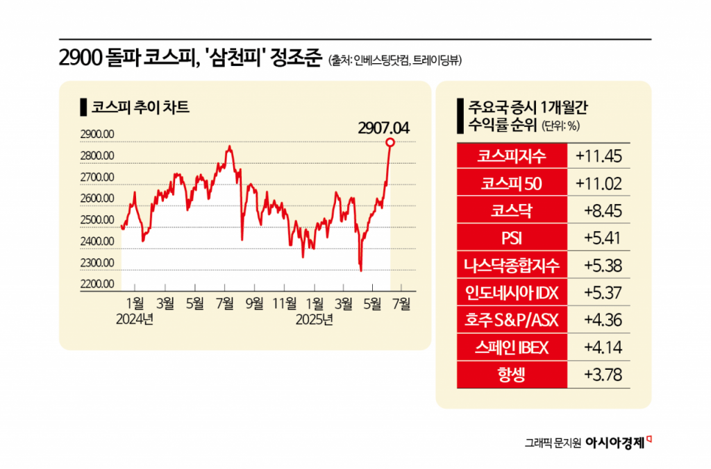 정국 불안정이 해소되면서 코스피는 연초 대비 20% 넘게 상승했다. 최근 1개월간 코스피와 코스닥은 각각 11.45%, 8.45% 뛰며 세계 주요 지수 가운데 나란히 선두권을 달리고 있다.