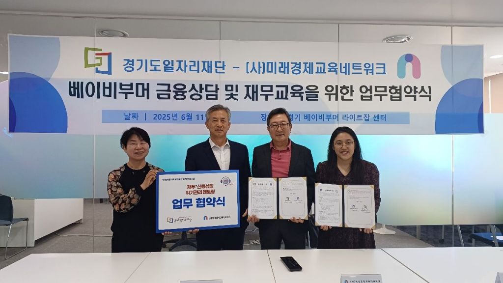경기도일자리재단이 11일 경기 베이비부머 라이트잡센터에서 사단법인 미래경제교육네트워크와 베이비부머 금융상담 및 재무교육 지원을 위한 업무협약을 체결했다.
