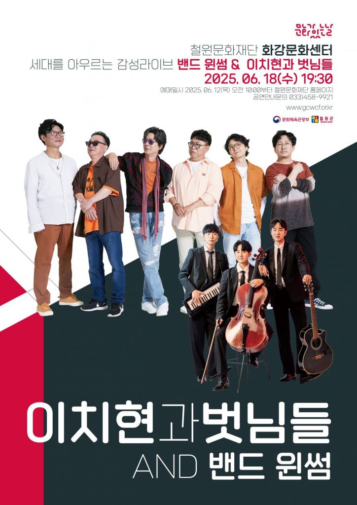 강원특별자치도 철원군(군수 이현종)은 11일, 철원문화재단이 6월 문화가 있는 날을 맞이해 18일 수요일 오후 7시 30분 화강문화센터에서 공연 ‘세대를 아우르는 감성 라이브-밴드 윈썸&이치현과 벗님들’을 개최한다고 밝혔다.